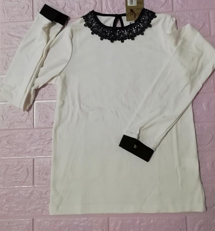 Нарядный трикотажный джемпер с длинным рукавом в классическом стиле. Рукава с манжетой на пуговице. Спереди по горловине кружевной воротник. На спинке застёжка – капелька. Запасная пуговка прилагается. Замеры: длина - 53, пог - 38, рукав от плеча - 57, плечи - 31