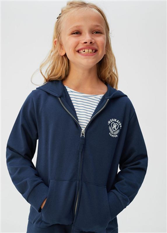 Спортивна кофта/французький трикотаж для дівчинки на 5 років на р.110. Тканина бавовняна. З капюшоном . Вишита напис. Довгий рукав . Дві бічні кишені. Застібка-блискавка спереду. СКЛАД: 100% бавовна.