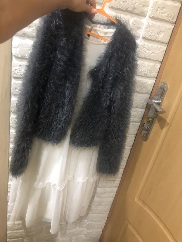 Пушистенькая кофта-болеро с паетками, состояние отличное, застегивается на 2 пуговки, размер указан 11-12лет, 152 рост Состояние новой вещи , в жизни светлее и очень красивая, мягкая, приятная