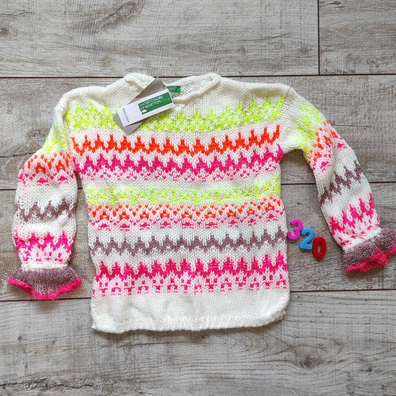 Светр яскравий, фірми BENETTON . На вік 4-5 р. , на ріст 110 см акрил 86%,шерсть 9%,поліамід 2%,мохер 2%,поліестер 1%
