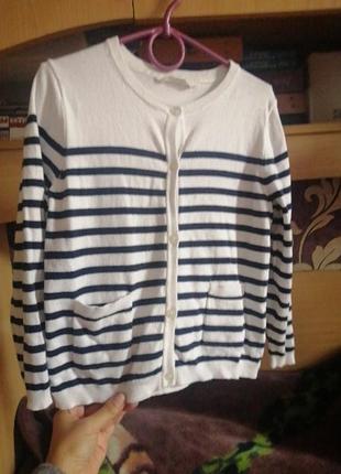 Кардиган Манго рост 122, соответствует размеру, в идеальном состоянии, полоска синяя, очень красиво в школу к синим школьным вещам
