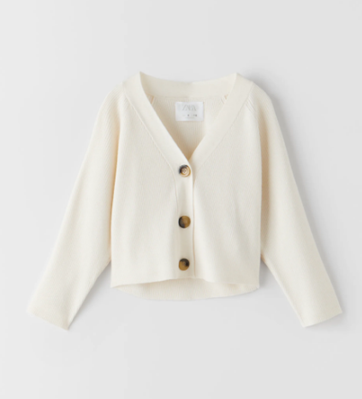 рикотажный кардиган с V-образным вырезом и длинными рукавами. Застежка на пуговицы. Размер 7 лет длина 40 см ширина 40 см рукав от горловины 51 см 52% ВИСКОЗА · 26% ПОЛИЭСТЕР · 22% НЕЙЛОН