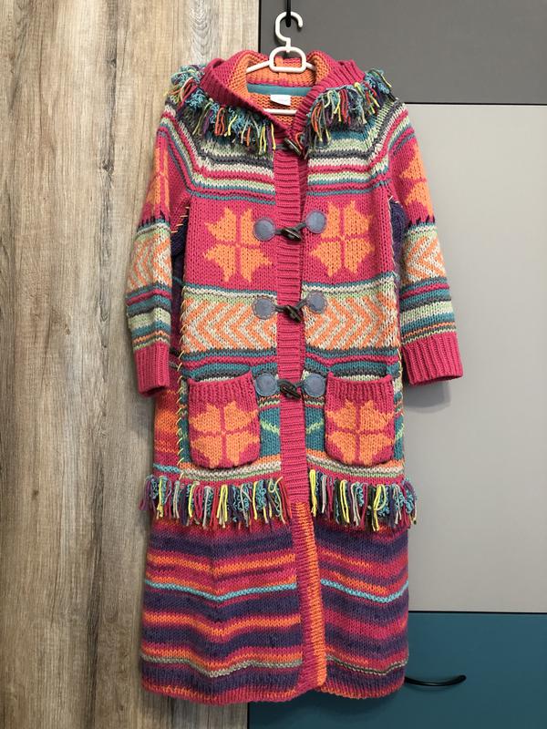 Длинное вязанное пальтишко( кардиган) в идеальном состоянии. Очень тёплое и эффектное. Цвет в действительности ярче, чем на фото. Замеры: длина 100 см, ширина по груди 44 см, длина рукава от горловины 55 см.