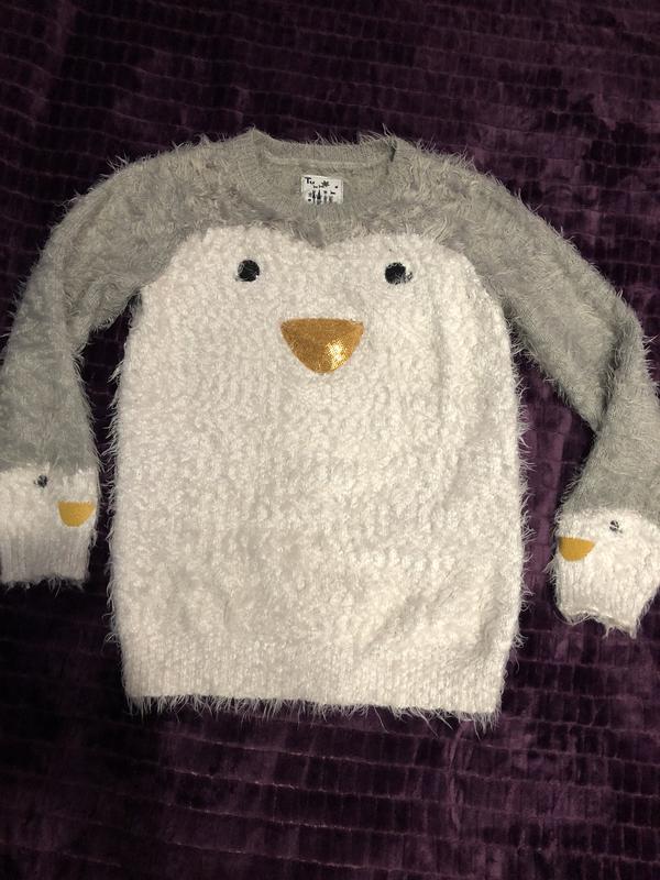 Очень красивый и тёплый фирменный свитерок,для девочки лет 10,все замеры можете видеть на фото.Красивый принт пингвина сделан с паеток. По надобности скину дополнительные фото!