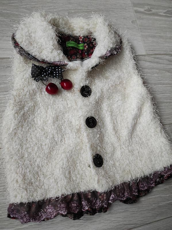 Цвет молочный.Брошка вишенки отстёгиваются, внутри флис. Верх мех травка.Состояние отличное. маленькое пятнышко возле пуговица на последнем фото видно.