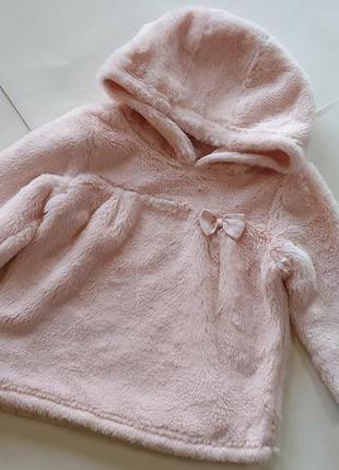 Нежно розовая меховая туника, свитер, худи с капюшоном на маленькую принцессу. Миленько украшен бантиком. Свободный силуэт по типу распашонки, длинный рукав. Мех мягкий, шелковистый, очень очень нежный. Размер указан 18-24мес. Длина - 37 ПОГ - 30 рукав - 31 Состояние новой вещи. Служба доставки на Ваш выбор.