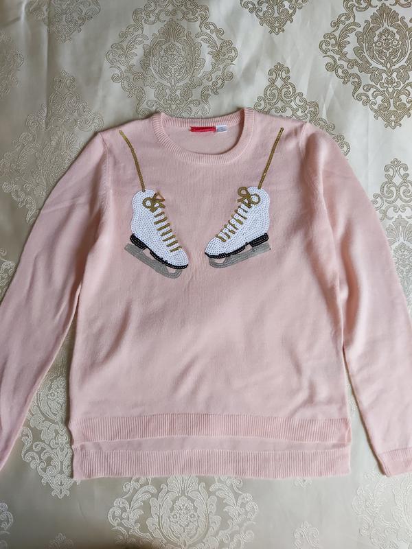 Очень красивая кофта. Перёд короче зад длинее. Аппликация коньки в паетки. Цвет пудра. Состояние идеальное. Замеры на фото.