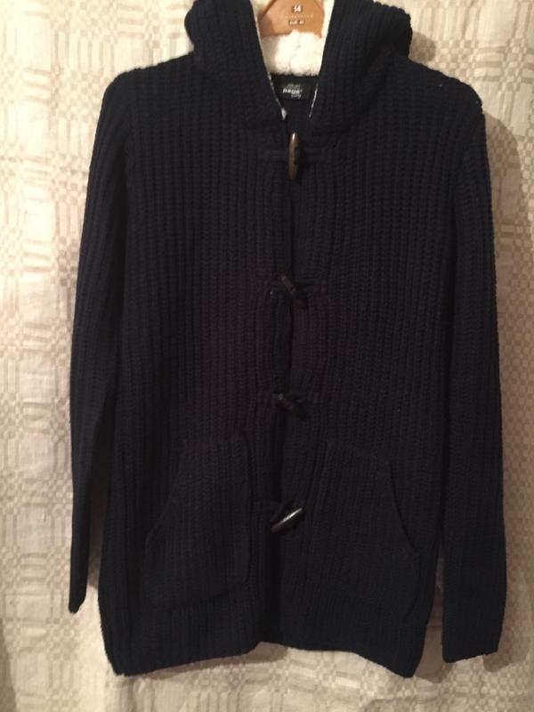 Темносиний вязаный кардиган с карманами и декоративными пуговицами и утепленным капюшоном Пог-47,дл рук-67,дл по спине-72см