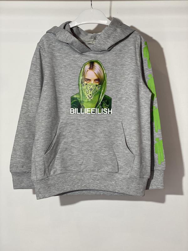 Серое худи двунитка для девочки с капюшоном, карман кенгуру, накатка спереди, сзади и на рукавах. Замеры: длина от плеча к низу 45 см, рукав от плеча 41 см.