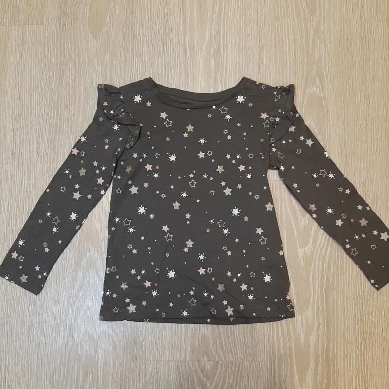 Реглан темно- сірого кольору з принтом зірочки: рожеві, білі, золотисті, на рукавах рюшки ✔вік5-6 років, зріст 116 см півобхват грудей 29,5см, довжина рукава 37см,плечі 26см, довжина по спині посередині 39см 💬100% котон 🏷c&a