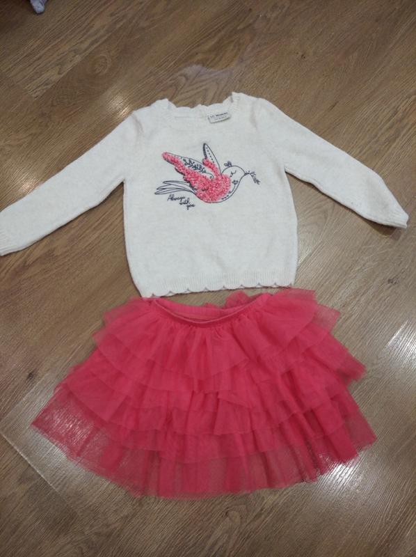 кофточка вайкики в хорошем состоянии покупалась новой 98/104. Юбочка с воланами. комплект одевался на праздники. нюанс -на одном воланчике затяжка (фото последнее), но из-за ярусности не видно. замеры на фото.