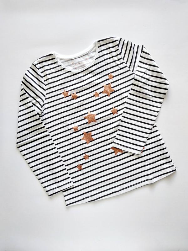 Размеры: 92 см (18-24 мес.), 98 см (2-3 года), 104 см (3-4 года), 110 см (4-5 лет), 116 см (5-6 лет), 122 см (6-7 лет), 128 см (7-8 лет). Замеры по запросу. Трикотажная футболка с длинным рукавом торговой марки Primark (Испания). Реглан в черно-белую полоску с золотистыми звездочками. Свободный крой, отличный вариант на каждый день. Состав: 100% cotton Без торга. Задавайте вопросы до оформления и оплаты заказа. 100% оплата на карту Приватбанка или наложенный платеж Новой почтой по предоплате. В г. Харьков возможна оплата наличными при самовывозе. Доставка: Новая почта и Meest день в день - если заказ оплачен до 12-00. Укрпочта и Justin по вторникам и четвергам - если заказ оплачен до 9-00. Воскресенье выходной.