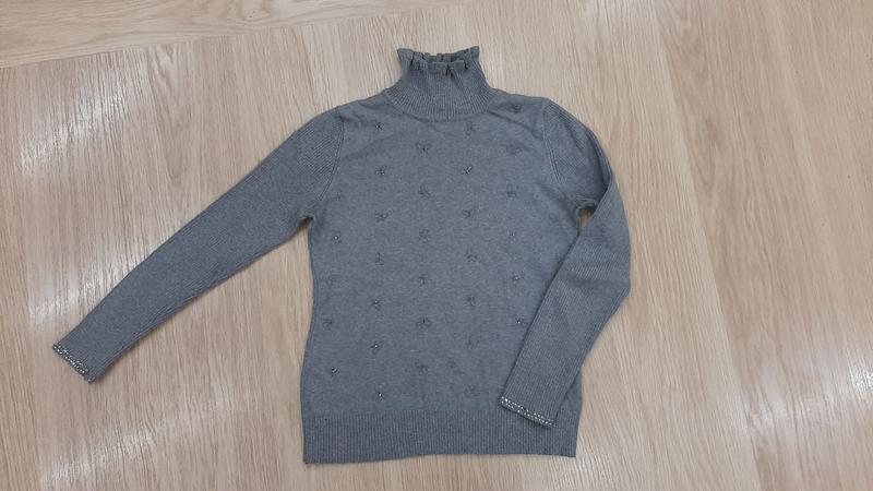 Свитер гольф в хорошем состоянии дырок,пятен нет,только несколько камушек отпало на рукавах,на фото показала.На бирке указано на 160,но реально 146-152.