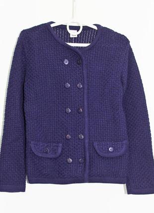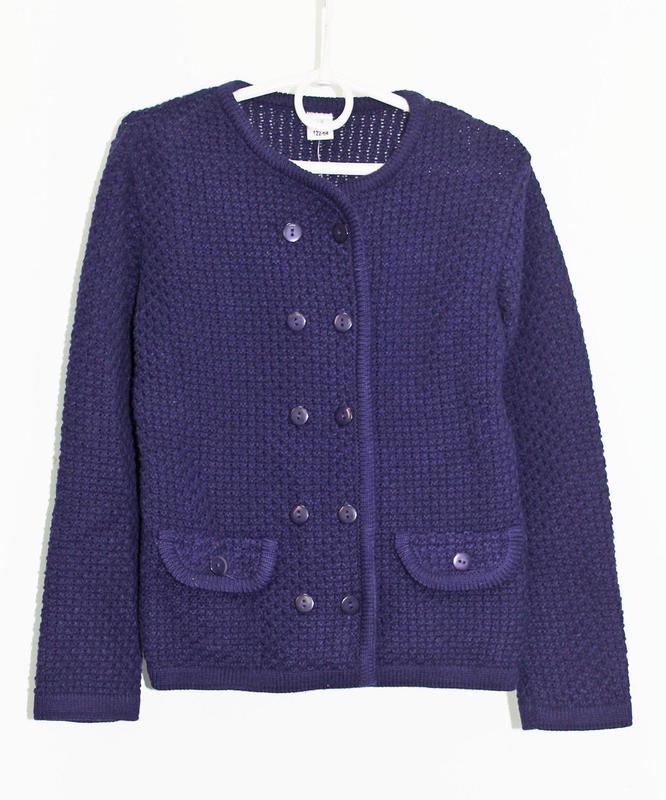 Жакет вязаный для девочки Отличная альтернатива костюмному пиджаку. Теплый, удобный вязаный жакет на пуговицах, всегда необходим в гардеробе школьника. Материал: шерсть, акрил Цвет т. синий Размер 122