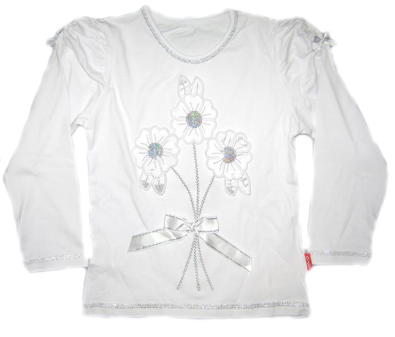 Батник для дівчинки Досить ошатний батничек. Прикрашений вишивкою і об'ємними квітами. Склад 100% бавовна Колір білий Розмір 104, 122