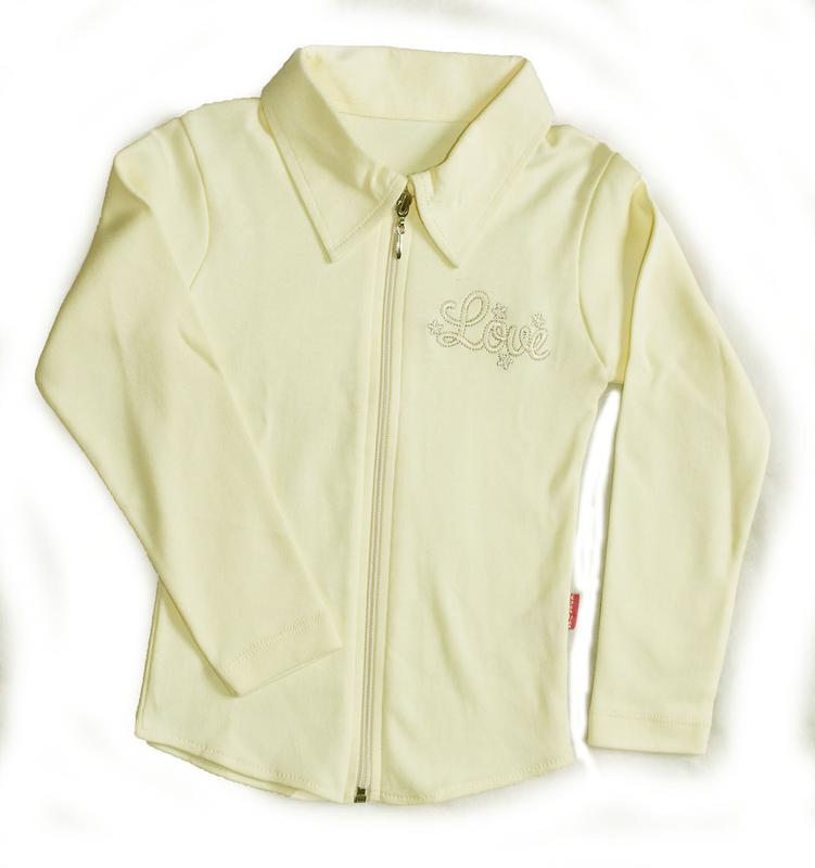 Батники для девочек Практичный, удобный батничек для девочек. Застегивается на молнию. Можно носить как кофточку или как регланчик под жилетку или пиджачек. Украшен вышивкой. Материал: 100 хлопок Цвет кремовый Размер 116