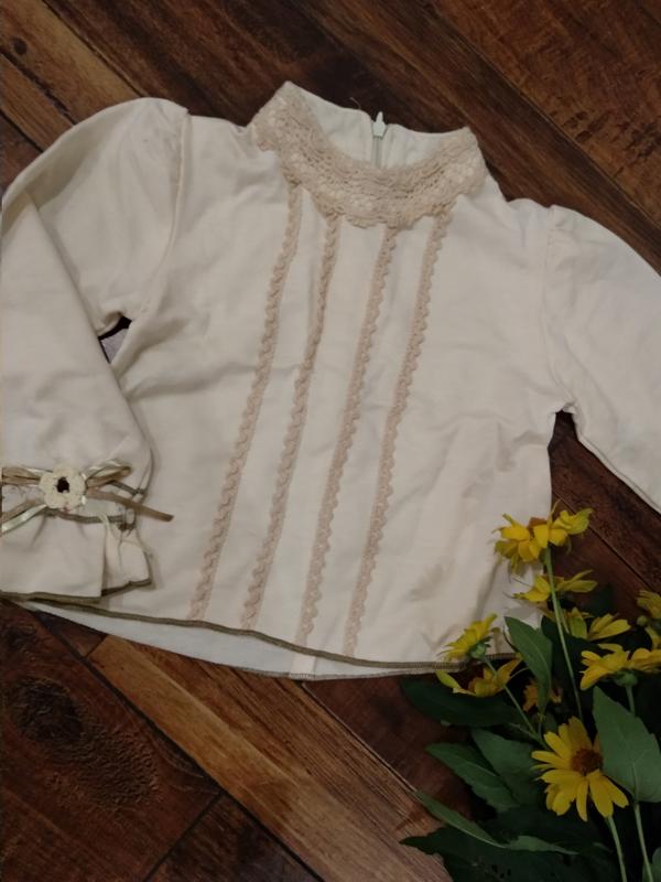 Красивая кофточка на девочку 3х или 4х лет,красивое оформление- воротник кружево,низ рукава красиво украшен.Длина -32,полуобхват под рукавами-29,рукав по наружному шву-35