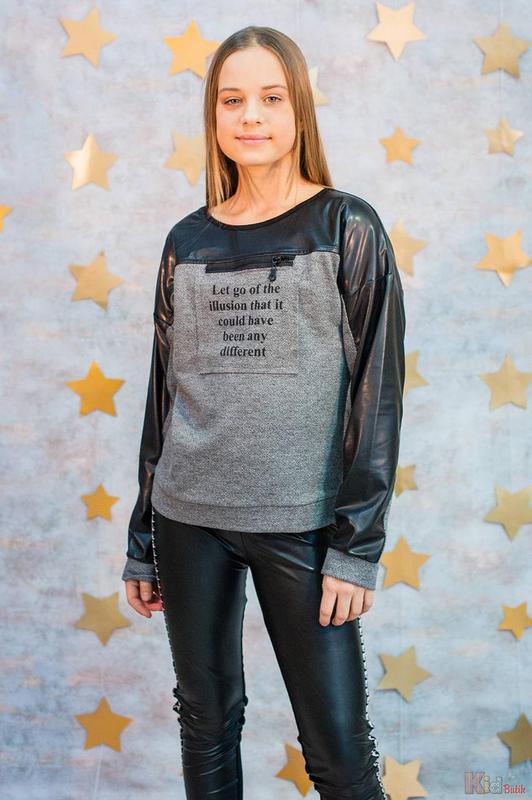 Приймаємо оплату карткою "Пакунок малюка". Интересный свитшот с элементами эко кожи для девочки. Украшением модели является бахрома на спинке. Изделие декорировано спереди надписью в виде кармана-обманки, что застегивается на молнию. Плечи и часть рукавов сшитые из эко кожи. Модель свободная, рукава и низ на широкой резинке. Такой свитшоты-мечта всех девочек.