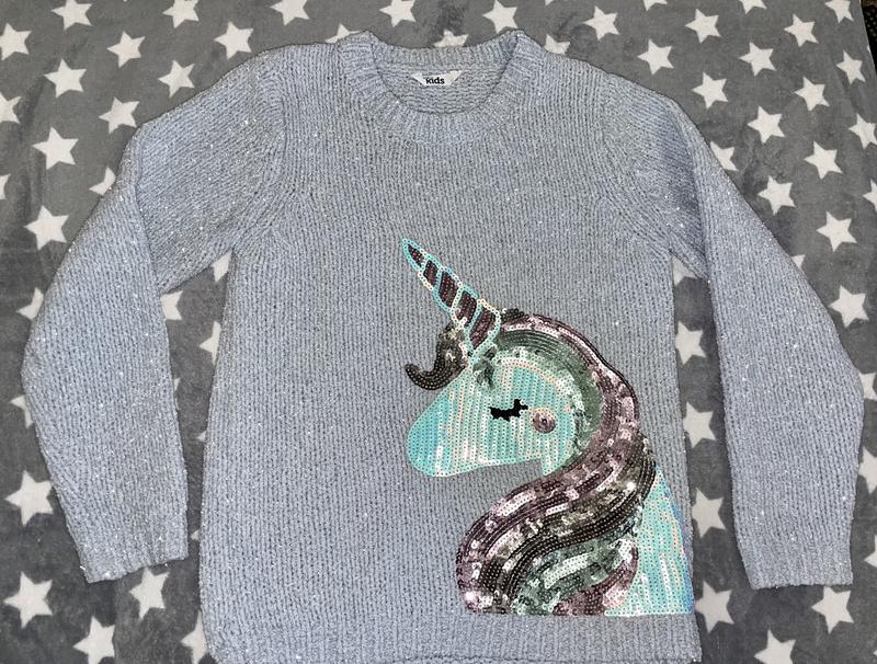 Свитер с люрексом типо травки. Очень красивого светло-серого цвета (в живую цвет нежно-голубой с серебристой нитью) с красивой единорожкой в нежных цветах. Камера не передаёт всей красоты. На возраст 9-10 лет. Очень хорошо тянется. Состояние новой вещи. Не носился.