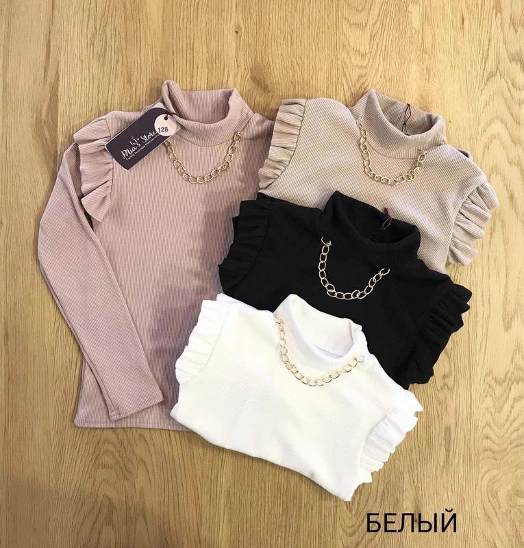 гольфик рюша ткань плотный рубчик с добавлением ангоры, очень приятный к телу. украшение цепочка рекомендую!!! Цена 450грн замеры:длина/рукав/пог 128-46/48/30 134-47/50/31 140-49/52/32 146-51/54/34 152-53/57/35 +-2см