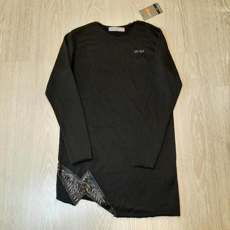 Туніка чорного кольору, на довгий рукав, краї не оброблені, низ асиметричний, з одного боку розшитий паєтками у формі блискавки, в текстурі тканини ледь помітні дрібні блискітки, туніка утеплена- по типу двох/трьох нитки ✔вік 13-14років півобхват грудей 44,5см, плечі 37см, довжина рукава 58см, довжина по спині посередині 75см, довжина від пахв і до низу з одного боку 60см, з другого 52см 💬55% котон, 25% поліестер, 20% ламе( lame-kreupele) 🏷 Piazza Italia