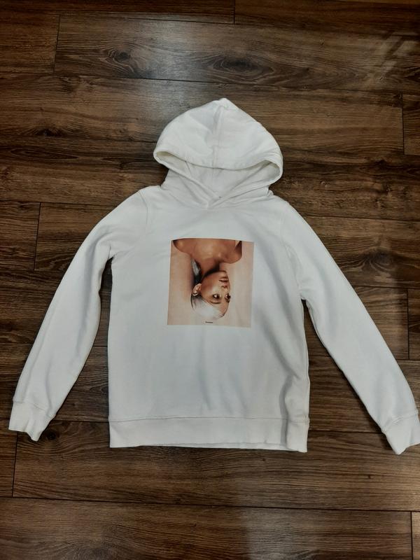 Кофта на флисе для девочки с капюшоном. Состояние идеальное. По манжетам видно, носилась мало. Бело молочного цвета. Ариана Гранде. Покупалась в Польше.