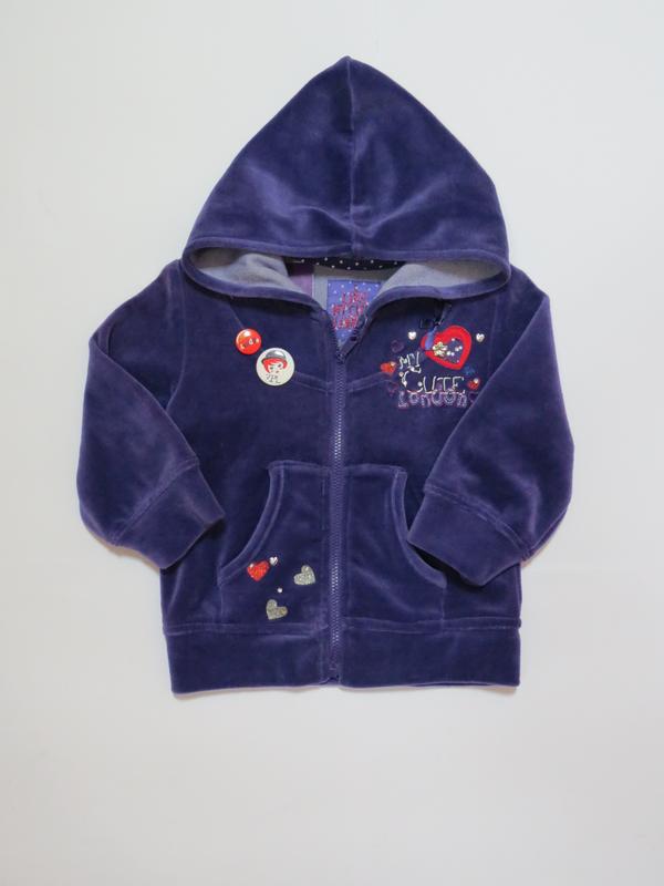Кофта для девочки Турция из плотного велюра 100% хлопок.На бирке указан 80р(но подойдёт на 86-92р.Замеры :длина кофты от плеча вниз-36см,длина рукава от плеча-27см,от шеи-33см,п\о груди-30см.2 кармана,украшена съёмными значками.Цена по распродаже.