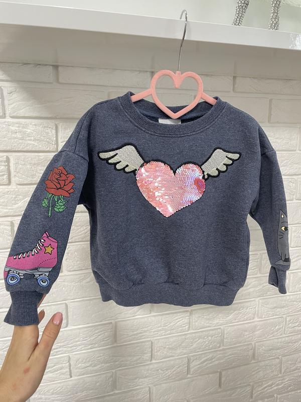 Стильный утеплённый свитшот Зара. Сердце из пайеток перевертышей, детям очень нравится, на рукавах рисунки будто татуировки. Указан размер 110 на 5 лет, но маломерит, будет на 4 года
