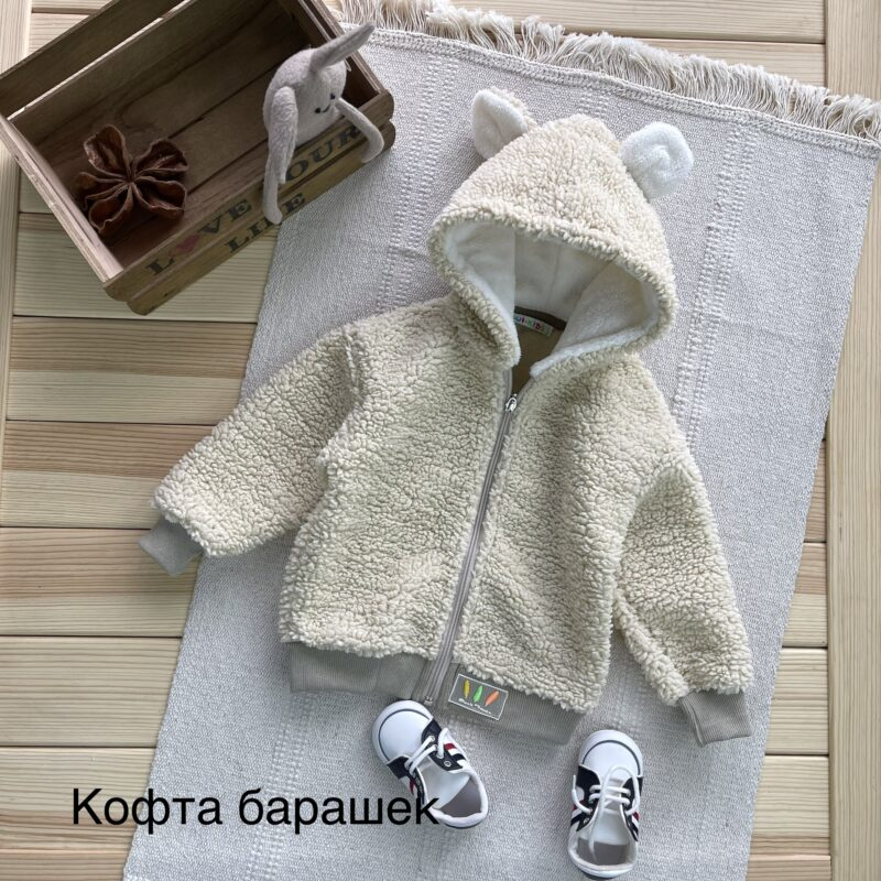 Она неимоверная! Кофта из “барашка”! тренд 2022 года! На змейке, манжеты- трикотажные! в капюшоне- мех- травка! Ушки- отлично держат форму! ✔ Размеры: 92 – дл 34, рук 27 98 – дл 35, рук 28 104 – дл 40, рук 31 110 – дл 41, рук 34 116 – дл 43, рук 38
