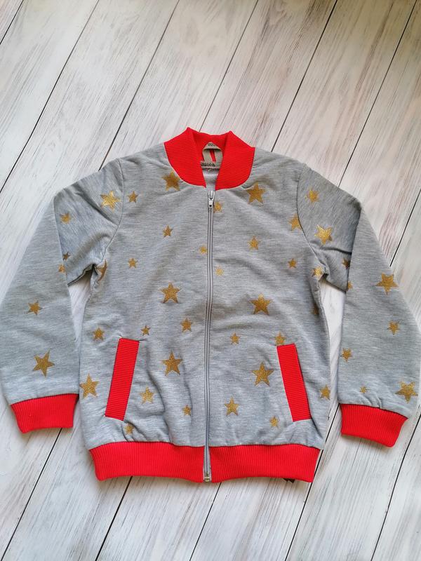 Бомбер сірого кольору з зірочками. Колір-сірий, напилення-зірочки, при пранні не змиваються. Яскраві манжети. Гарна якість.