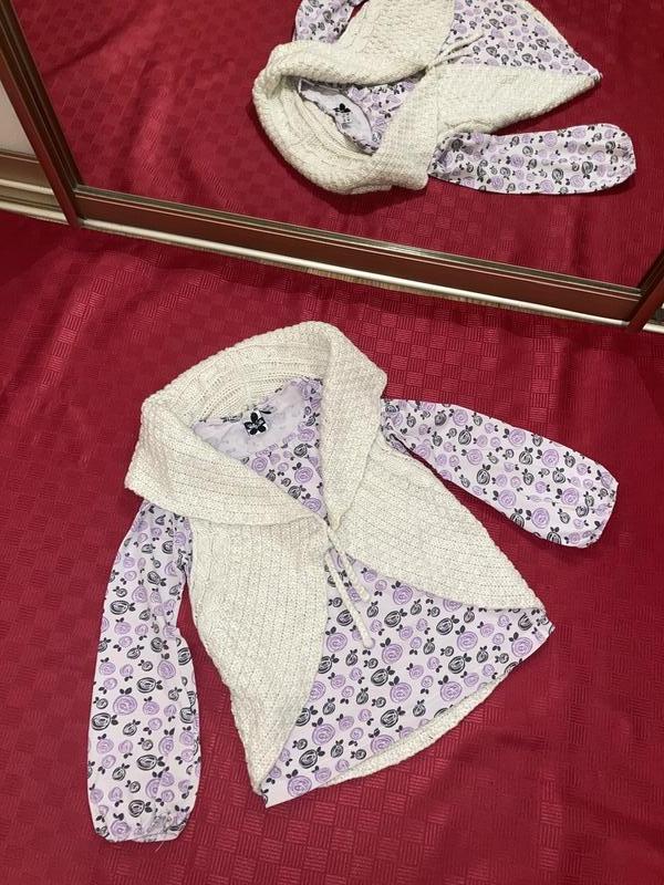 Очень стильный лук. Реглан с оригинальным рукавчиком на 6-7 лет, в идеале. Замеры: длина 41 см, ширина 34 см, рукав 39 см. Кардиган LOGG 122-128 см, 6-8 лет. Очень красивый фасон и нарядная вязка. Обалденная вещица!!!! Замеры: длина 55 см по спинке, ширина 34 см. Нити хлопок, шерсть и полиамид. Не кошлатится, мягкая на ощупь.