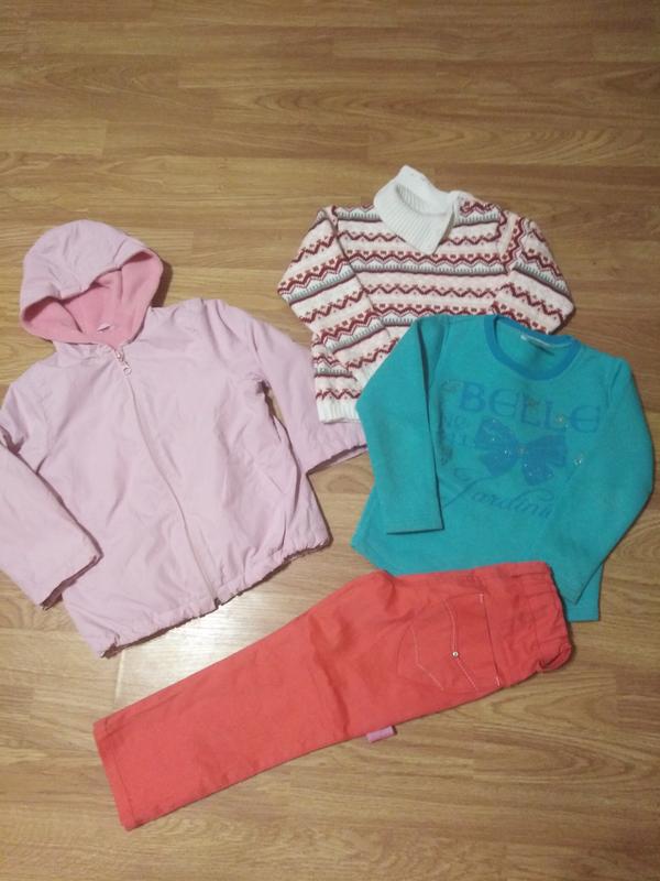 В набор входит ветровка на флис (нет в наличии) двой теплые кофты, брюки, на рост 98, в подарок поставит шапочку.
