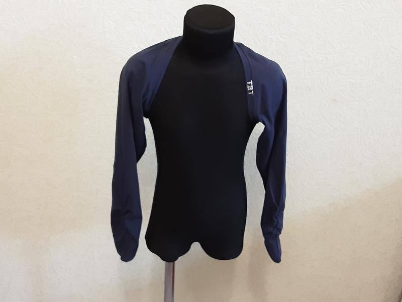 Класне трикотажне болеро від відомого італійського бренду To be Too. Без застібок. 👉Є невелика емблема бренду, викладена стразиками. Колір: синій Розмір на бірці 36 (на ріст 134 см - орієнтуйтеся по замірах): •довжина по спинці - 21 см; •довжина рукава від краєчка ворота - 56 см, від пахви - 40 див. Склад: 94% бавовна, 6% еластан
