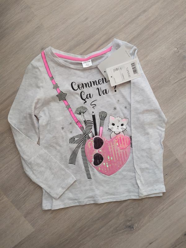 Реглан для дівчинки фірми Ostin. Реглан сірого кольору з симпатичним принтом спереду, справжній кишеня з пакетами і блискучими клієнтами. Склад: 100% бавовна Розмір 5-6 років на ріст 116см ПОГ - 33см, ширина між плечима - 28,5 см, довжина реглана від плеча - 44,5 см, довжина від горловини/від пахви - 47,5 см/31см
