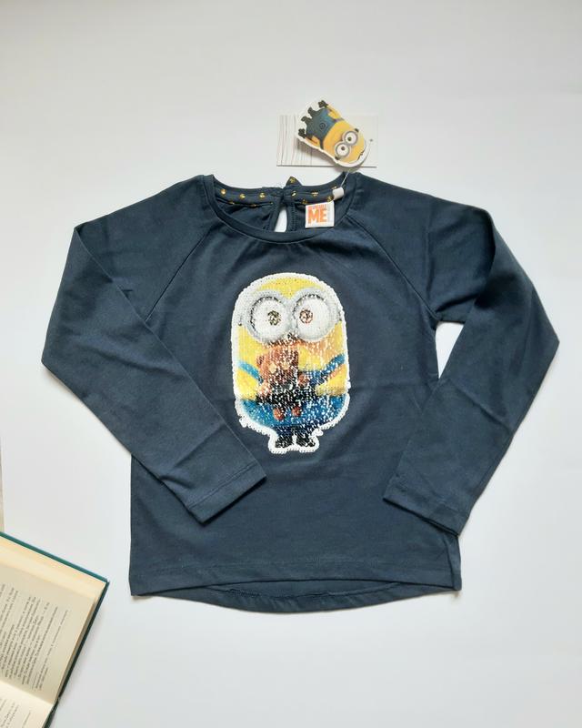 Прикольний релан для дівчинки на сезон весна- літо- осінь.Аплікація з паєтків перевертається і робиться новий вираз обличчя міньйона. Колір темно синій. Ззаді на спині бантик. Розмір 116 Довжина 43 см, ширина по спині31 см, рукава 43 см. 100% cotton