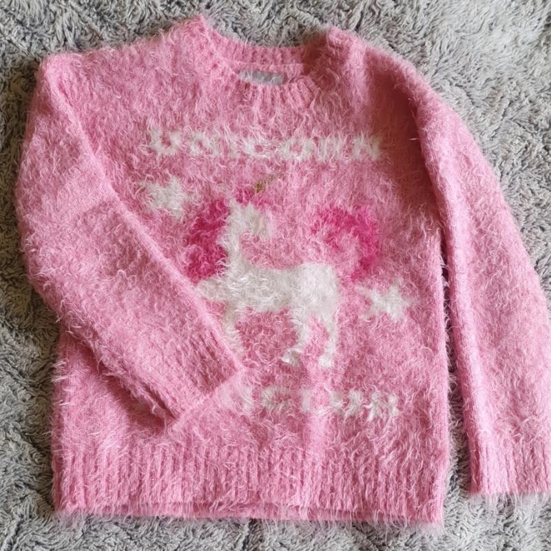 Дуже м'якенький светрик ,ніжно рожевий з єдинорогом. В ідеальному стані без дефектів. Заміри на фото
