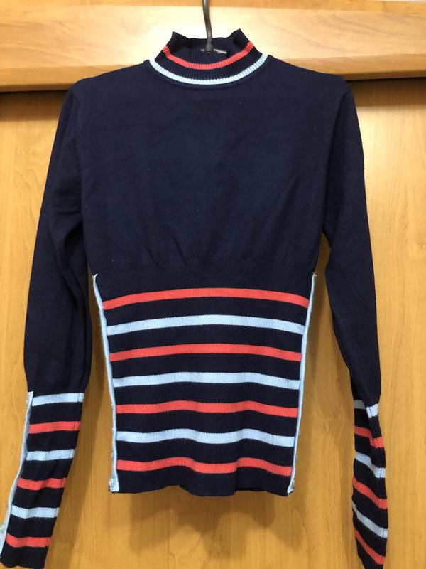 Темно синий свитер на девочку💖 стрейчевый, там где полосочки -резинка, украшен пуговичками. Состояние нового👍 Длина 49 см, длина рукава53 см можно подкотить, ширина плечей 31 см замеры в не растянутом виде