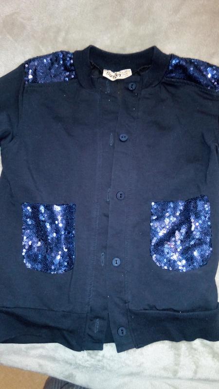 Неймовірна кофточка для красуні. Тканина трикотаж двунітка. Кофта купувалася дуже дорого, так як якість відмінна. Підійде під любий стиль і образ. Донька одягнула 2 рази про школи осінню . Стан відмінний. Паєточки виблискують на сонечку-гарно і стильно. Колір - темно-синій. На вік від 6-9 років підійде.