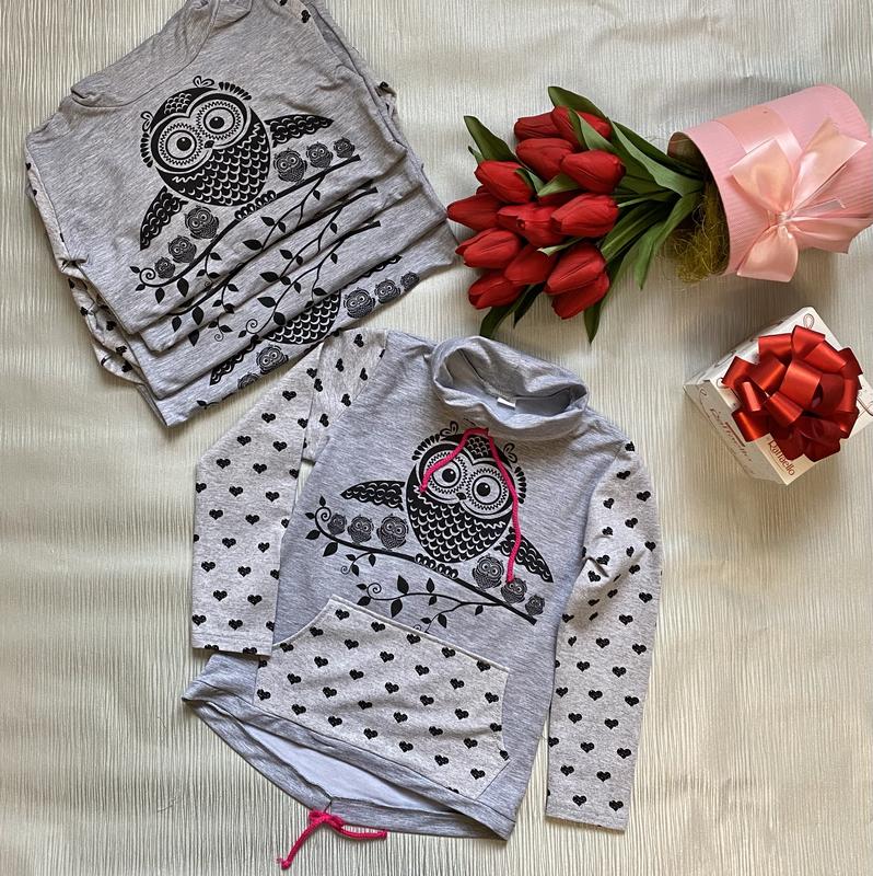 Очень красивая кофточка с совушками, горловина с отворотом, спереди кармашек кенгуру, ткань двухнитка. Размеры от 128 по 152. Замеры по запросу