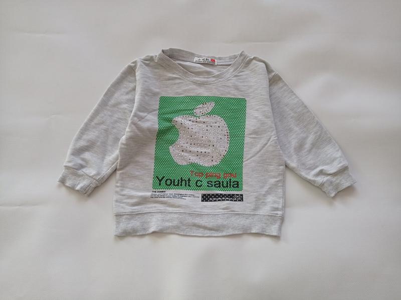 Цена указана при условии заказа от 300 грн. Славный и качественный реглан. Состояние для дома. Дырок и пятен нет. Чуть посыпались пайетки на яблоке. Замеры: плечи 32 см под мышками 34 см низ 30 см рукав 27 см, от горловины 34 см длина 38 см Состав: 100% хлопок