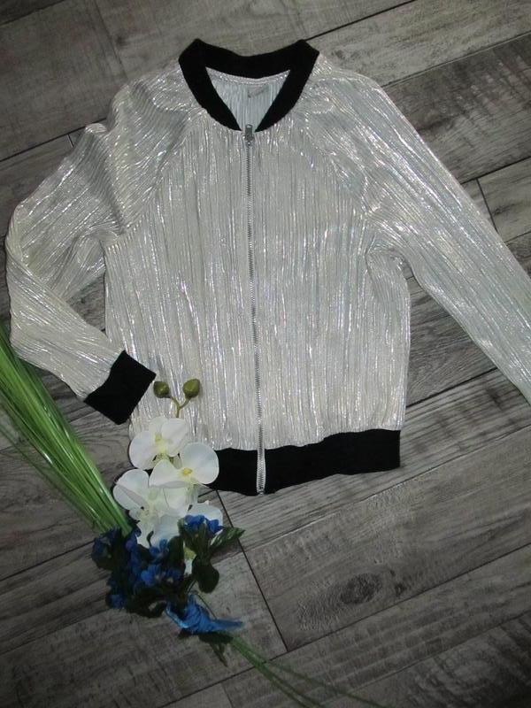 Легкая кофта бомбер TU рост 116см Стильный крой, Цвет silver, фурнитура -silver. Сделает любой самый простой наряд стильным. комфортный и функциональный крой.по вороту и низу трикотажная контрастная резинка. Состав ткани 100% Polyester. Утеплителя нет. Замеры : длина по спинке- 40см,пог- 36см, рукав от горловины 52см, по низу- 32см. без растягивания резинки. Состояние идеальное. цена -200грн.