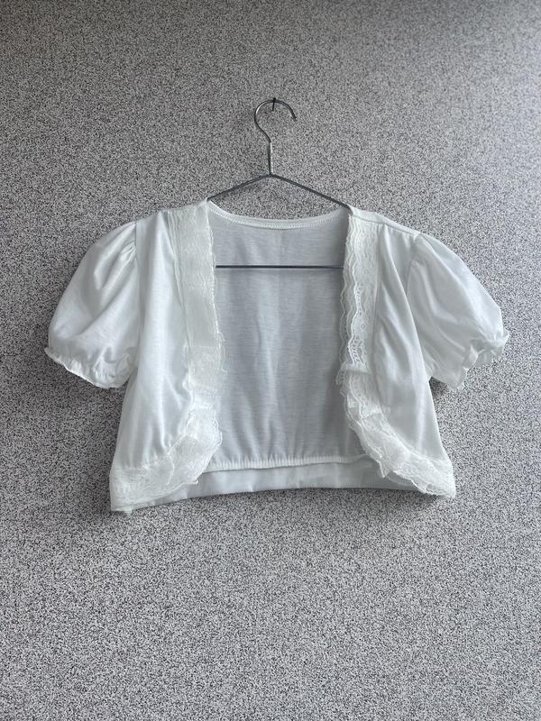 Дуже ніжне балеро для дівчинки Не жарке, ідеально підійде на теплу весну чи літо Натуральна тканина Ширина плечей (між швами) - 36 см Ширина в грудях - 44 см