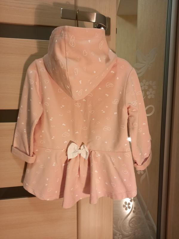 Красивая ,хлопковая ,качественная на змейке с капюшоном кофточка.Есть кармашки и красивый бантик .Длина передней части 38см,задней 44см,длина рукава от плечя 34см.