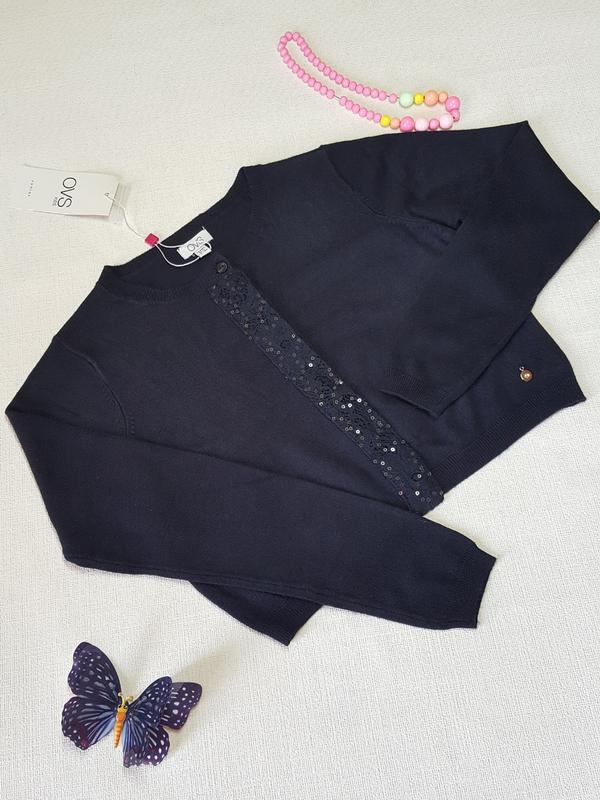 Трикотажна кофточка на гудзиках для дівчинки OVS, укорочена Розмір 146. Колір: темно - синій Тканина - тонка в'язання На планці вставка з мережива з паєтками Заміри: Плечі 30см ПОГ 36см Довжина 34см Довжина рукава 48см Нова, з биркою