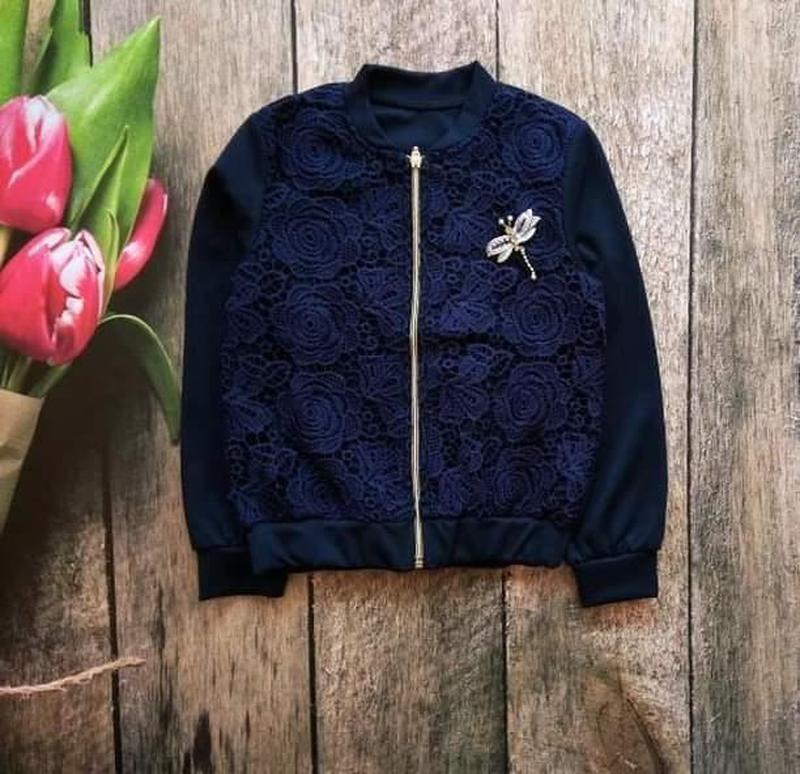 Стильный , нарядный бомбер для девочки. Состояние идеальное. Очень хорошо подойдет для школы. Очень качественное кружево. На рост 140см, замеры по требованию. Брошка стрекоза в комплекте.