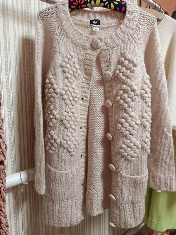 Ніжний та романтичний кардиган. В складі шерсть, мохер, акріл. Стан відмінний. Оригінальна в'язка, гудзики теж в цьому стилі. Має два карманчика накладні. Колір лате, шампань. Довжина 76 Пог 43 Рукав від воротніка 69