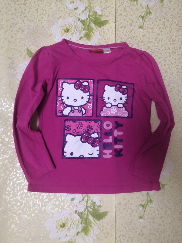 Кофта - реглан Hello Kitty на ріст 110-116 див. В складі тканини 100% котон. Довжина по середині спинки 40 см, довжина від підпахви вниз по боковому шву 26 см, плечі 26 см, рукав від плеча 38 см, півобхват талії 31,5 див.