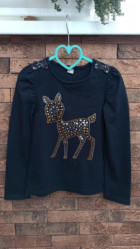 Фирма Tu. По бирке 7 лет (122 см). 100% коттон. В очень хорошем состоянии! Темно-синего цвета. На плечиках бантики. Спереди большой олень из пайеток (одной нет, из-за их количества не видно). На локтях латки из той же ткани, что и бантики. Спинка украшена бантиком и пуговичками (не расстегиваются). Смотрится очень красиво, нарядно!