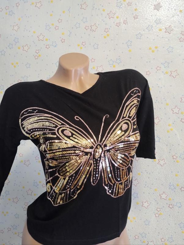 реглан з метеликом. вишивка паєтками. стан дуже гарний, недоліків немає. рукав три чверті. напів об'єм грудей 35см, довжина 46см