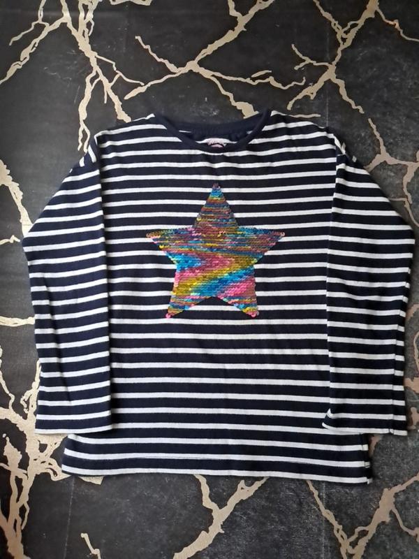 Реглан в полоску, с красивой звездой в паэтках, состояние идеально ближе к Новому.Размер 3-4 рочки.Довжина 39,5 рукав от горловины 41, поног32